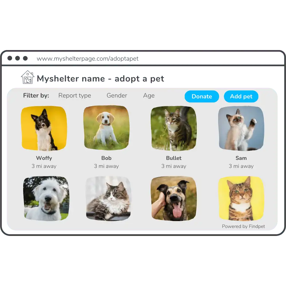 Help reuniting more pets by connecting to Findpet and sharing information about pets in your shelter. This way Findpet will be able to automatically search lost pets in your shelter. Talk to your shelter management software provider or reach out to us.